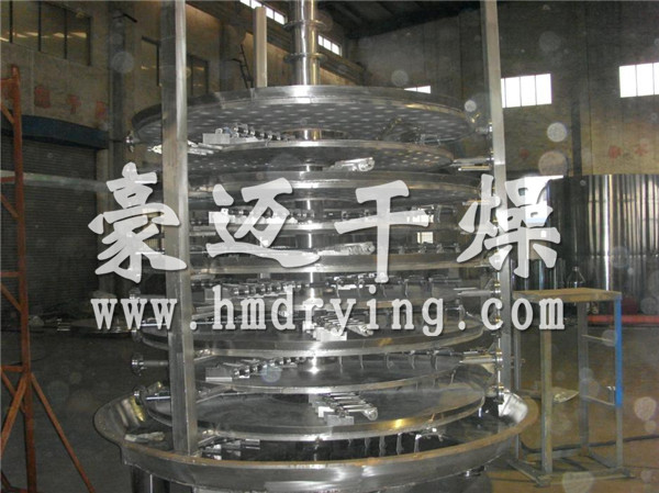 湿物料自加料器连续地加到干燥器上部第一层干燥盘上,带有耙叶的耙臂作回转运动使耙臂作回转运动使耙叶连续地翻抄物料。物料沿指数螺旋线流过干燥盘表面,在小干燥盘上的物料被移送到外缘,并在外缘落到下方的大干燥盘外缘,在大干盘上物料向里移动并从中间落料口落如下一层小干燥盘中。大小干燥盘上下交替排列,物料得以连续地流过整个干燥器。中空的干燥盘内通入加热介质,加热介质形式有饱和蒸汽、热水和导热油,加热介质由干燥盘的一端进入,从另一端导出。已干物料从^后一层干燥盘落到壳体的底层,^后被耙叶移送到出料口排出。湿份从物料中逸出,由设在顶盖上的排湿口排出,真空型盘式干燥器的湿气由设在顶盖上的真空泵口排出。从底层排出的干物料可直接包装。通过配加翅片加热器、溶剂回收冷凝器、袋式除尘器、干料返混机构、引风机等辅机,可提高其干燥的生产能力,干燥膏糊状和热敏性物 料,可方便地回收溶剂,并能进行热解和反应操作。